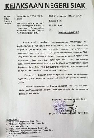 Adapun surat yang dimaksud bernomor: B-2587/N.4.14.8/CS/11/2017, tertanggal 1 November 2017. Dalam surat tersebut tertera perihal Permintaan Keterangan dan atau pemanggilan Pejabat di Lingkungan Pemerintahan Kabupaten Siak oleh Pejabat Kejaksaan Negeri Siak.