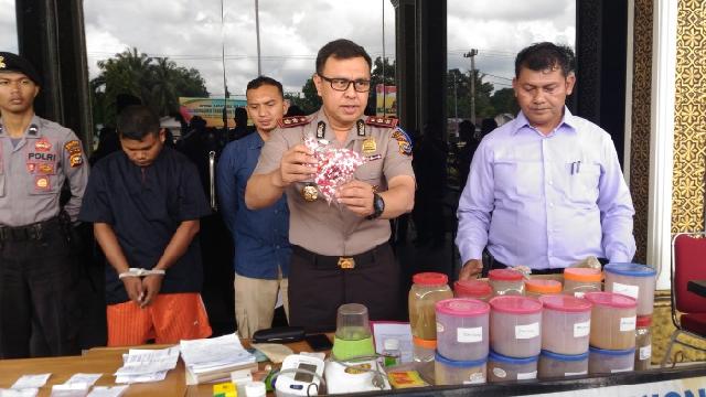 KAPOLRES Kampar AKBP Deni Okvianto SH, MH memperlihatkan obat kapsul yang sudah diracik pelaku didampingi Kasat Narkoba Iptu Asdisyah Mursid SH