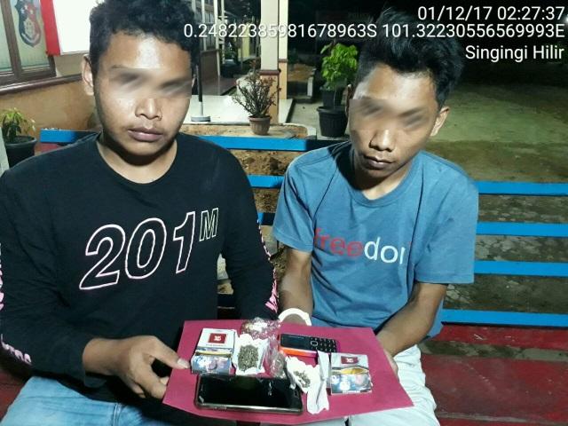 RIAUMANDIRI.co, TELUK KUANTAN - Polsek Singingi Hilir Polres Kuansing melakukan panangkapan terhadap dua orang diduga pelaku penyalahgunaan narkotika jenis daun ganja kering di areal perkebunan kelapa sawit desa Sungai Buluh, Kamis (30/11/2017) pukul 23.00 WIB. Pelaku diketahui berinisial MN (24), seorang mahasiswa dan FR (19) yang merupakan seorang petani.