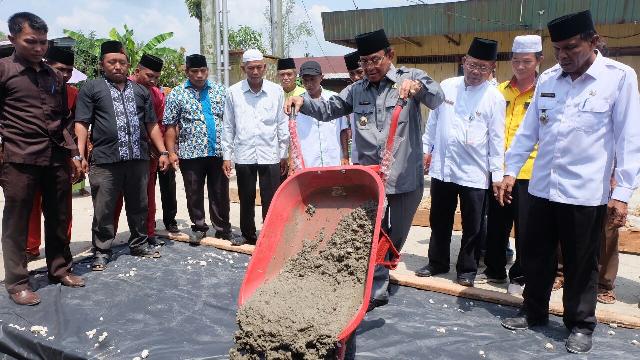 RIAUMANDIRI.CO, TEMBILAHAN - Bupati Inhil, HM Wardan melakukan pencurahan cor pertama rabat beton jalan kegiatan pembangunan Desa Pebenaan, Kecamatan Keritang, Jum'at (4/8/17).
