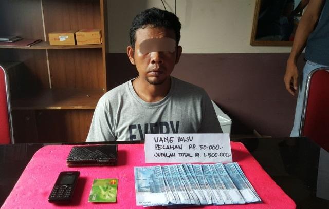 Dari tersangka disita barang bukti berupa 30 lembar pecahan uang Rp 50.000, dengan jumlah Rp 1.500.000, yang diduga palsu, 2 lembar uang pecahan 1 Ringgit Malaysia, 1 buah kartu ATM BRI, dan 1 unit HP nokia warna hitam. Saat diamankan, lelaki asal Aceh itu sedang bersama dengan teman wanitanya berinisial FS (31), warga Kotamadya Tebing Tinggi Sumatera Utara.