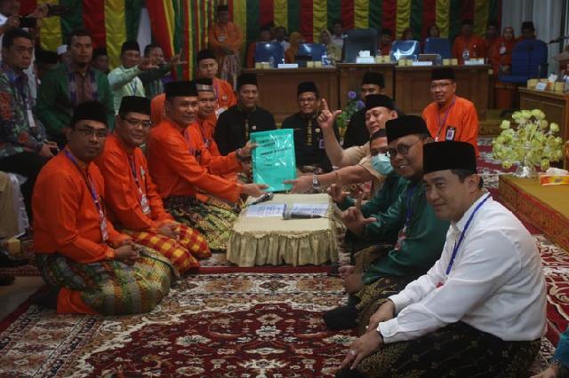 Ketua KPU Riau didampingi empat komisioner, Ketua Bawaslu dan anggota serta Sekretaris KPU Riau, menerima pendaftaran pasangan Lukman Edy-Hardianto. (Foto: RMC/Andika)