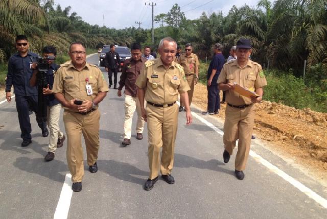 Gubernur Riau melihat kondisi jalan di Okura Rumbai yang telah diaspal. Jalan ini akan dibuka ke Perawang dengan jarak 26 km