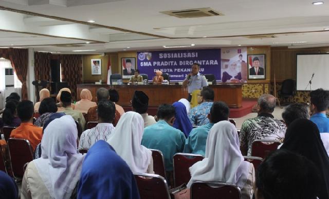RIAUMANDIRI.CO, PEKANBARU - Tim dari Yasarini Pusat melakukan sosialisasi SMA Pradita Dirgantara di Aula Kantor Walikota Pekanbaru, Jumat (19/1). Kegiatan ini dibuka secara langsung oleh Wakil Walikota Pekanbaru Ayat Cahyadi, dan dihadiri sekitar 250 orang dari berbagai SMP dan MTs, yang terdiri dari para murid, guru, orang tua murid serta tamu undangan.