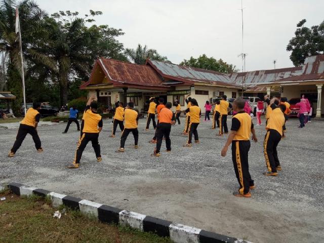 RIAUMANDIRI.CO, KAMPAR - Sejumlah Anggota Bhayangkari Ranting Siak Hulu di Kabupaten Kampar menggelar senam bersama dengan personel kepolisian setempat di Halaman Mapolsek, Sabtu (20/1).