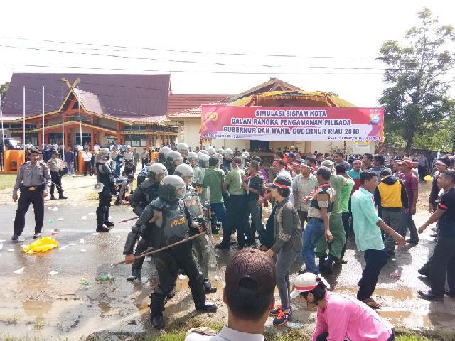 Simulasi pengamanan Pilgubri 2018 saat Latihan Pra Operasional Mantap Praja Muara Takus Polres Inhu.