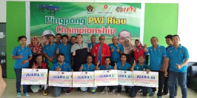 Pemenang Pingpong PWI Riau Championship foto bersama dengan Kepala Humas SKK Migas Heriyanto, Ketua PWI Riau Zulmansyah Sekedang, dan Humas PGPA PCI Yulia Rintawati.
