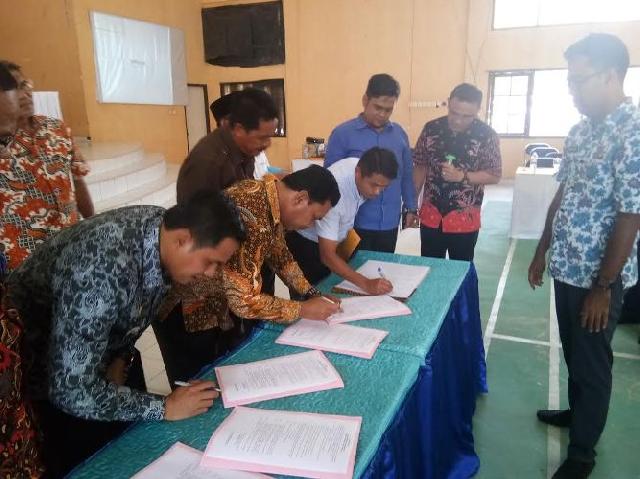 Kabid LPP Bappeda M. Fadli Mukhtar menyaksikan penandatangan berita acara Musrenbang di aula kantor Camat Kampar Kiri di Lipat Kain, Kamis (15/2/2018). (Foto: RMC/Herman Jhoni)
