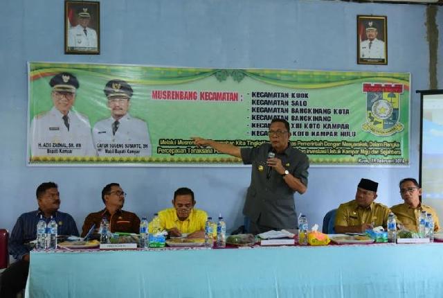 Demikian disampaikan Bupati Kampar, Azis Zaenal saat membuka Musyawarah Rencana Pembangunan (Musrenbang) Rencana Kerja Pemerintah Daerah (RKPD) di Wilayah V di aula kantor Camat Kuok, Senin (19/2/2018).