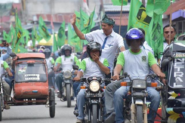 RIAUMANDIRI.CO, ROHUL - Jalan Sudirman Ujung Batu menghijau. Kibaran bendera Partai Persatuan Pembangunan (PPP) mewarnai arak-arakan becak yang membawa Calon Gubernur Riau, Dr H Firdaus, MT, Ahad (25/2/18) menjelang siang.