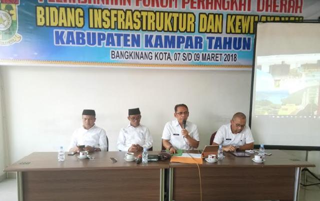 Kepala Bappeda Kabupaten Kampar Azwan didampingi Ketua DPRD Kabupaten Kampar Ahma Fikri, Wakil Ketua DPRD Sahidin dan Kadis PUPR Afdal memimpin rapat Forum Perangkat Daerah bidang Infrastruktur dan Kewilayahan di aula Bappeda, Rabu (Foto: RMC/Oni)