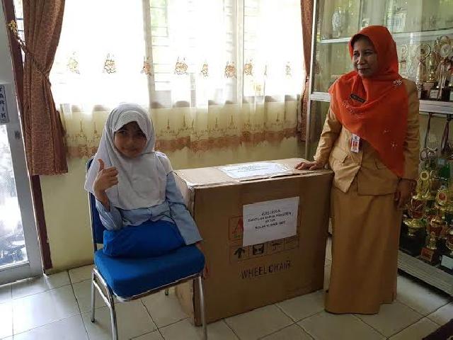 Kursi roda yang diterima Bulan Karunia diserahkan oleh Kepala Dinas Kesehatan Provinsi Riau, Mimi Nazir, atas nama Presiden Joko Widodo. Dan diserahkan langaung ke sekolah tempat Bulan sekolah, Selasa (20/3/2018).
