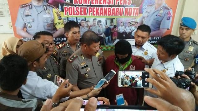 Pelaku diwawancarai wartawan saat konferensi pers yang digelar Kamis (22/3/2018) di Mapolsek Kota Pekanbaru.