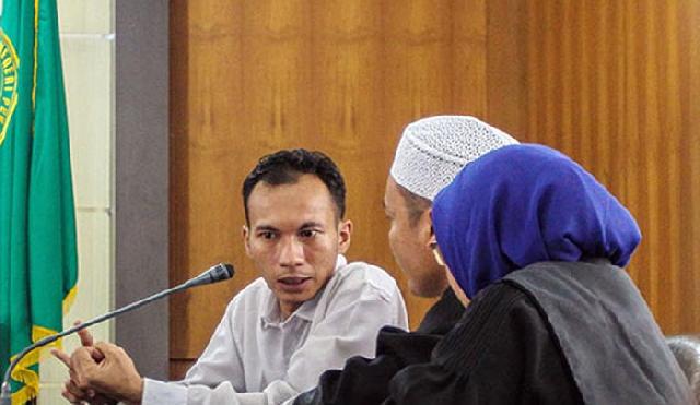 Terdakwa penyebar ujaran kebencian Jasriadi (Saracen Grup) berdialog dengan penasihat hukum usai mendengarkan pembacaan vonis di Pengadilan Negeri Pekanbaru, Jumat (6/4/2018).