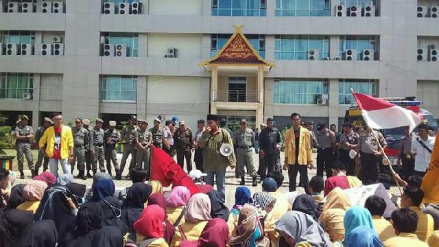 Puluhan Mahasiswa yang tergabung dalam Aliansi Pemuda Mahasiswa Inhil (APMI) mengelar aksi unjuk rasa di Halaman Kantor Bupati Kabupaten Indragiri Hilir