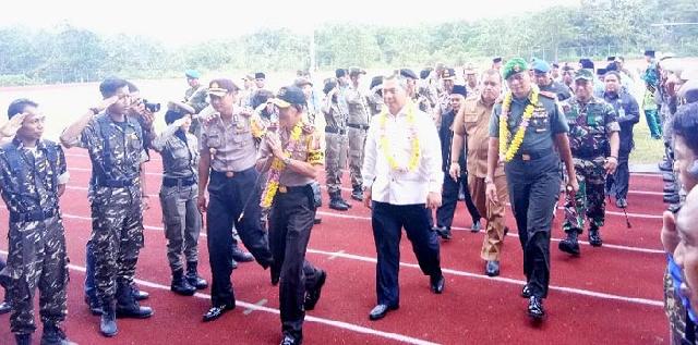 Kedatangan Kapolda Riau Irjen Pol Nandang, Danrem 031 Wirabima Brigjen TNI Sonny Apriyanto dan Kepala Intelijen Daerah Riau Marsma TNI Rakhman Haryadi disambut anggota Polri dan TNI serta jajaran pemerintahan di Inhu.