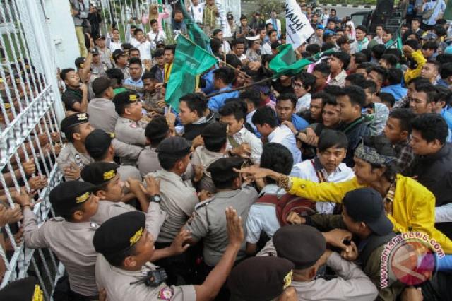 Massa dari berbagai elemen unjuk rasa di depan Kantor Gubernur Riau menolak pembangunan Waduk Rokan Kiri, Senin (23/4/2018)