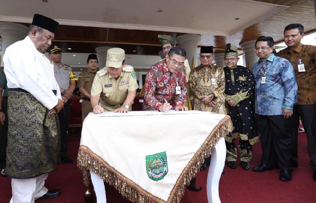 Plt Gubernur Riau Wan Thamrin Hasyim menyaksikan Bupati Rohul Sukiman dan Dirut Bank Riau Kepri Irvandi menandatangani MoU pemindahan kas daerah Rohul ke Bank Riau Kepri.