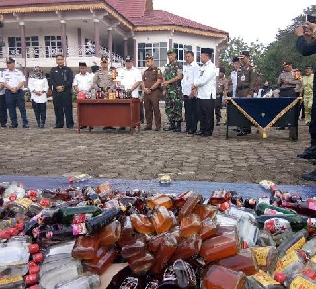 RIAUMANDIRI.CO, RENGAT - Polres Indragiri Hulu melaksanakan pemusnahan ribuan botol miras berbagai merek dan petasan, Rabu (6/6/2018) di halaman DPRD Inhu. Miras dan dan puluhan ribu petasan ini merupakan hasil sitaan dalam operasi cipta kondisi Ramadan 2018.
