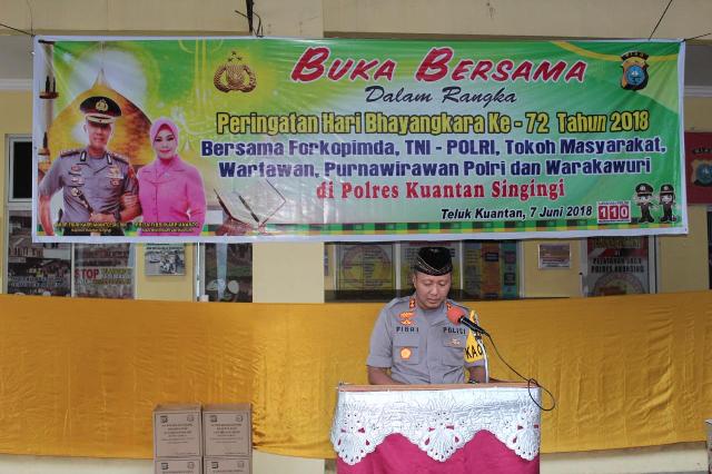 RIAUMANDIRI.CO TELUK KUANTAN - Memperingati hai ulang tahun Bhayangkara ke 72, Polres Kuansing memberikan santunan kepada anak yatim sebanyak 25 orang sekaligus buka bersama antara Kapolres Kuansing beserta dengan Forkopinda, TNI-Polri tokoh masyarakat, wartawan, warakawuri, dan anak yatim di Mapolres Kuansing, Kamis (7/6/2018).