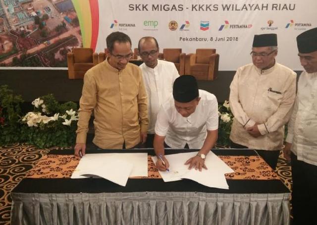 Penandatanganan naskah kerjasama itu dilakukan bersempena dengan acara berbuka puasa bersama yang dibingkai dengan Edukasi Wartawan SKK Migas-KKKS Wilayah Riau di Hotel Pangeran.