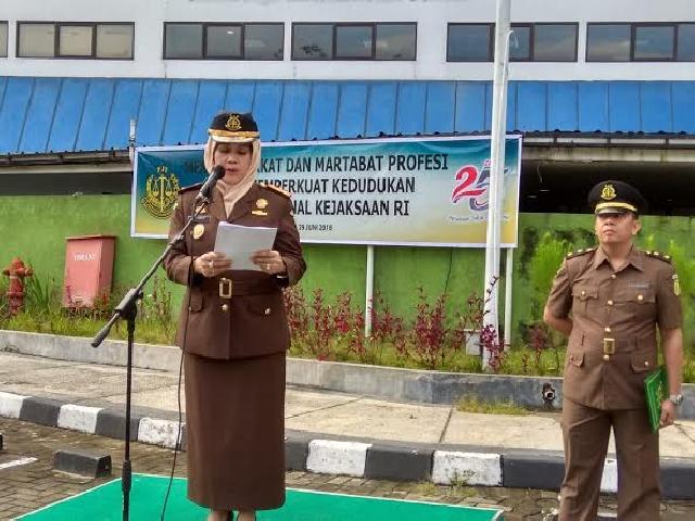 Harapan itu disampaikan Wakil Kejaksaan Tinggi (Wakajati) Riau, Mia Amiati, membacakan amanat Jaksa Agung, dalam upacara peringatan hari ulang tahun (HUT) ke-25 Persatuan Jaksa Indonesia, Jumat (29/6/2018). Pelaksanaan upacara digelar di lapangan kantor sementara Kejati Riau, di Jalan Arifin Ahmad Pekanbaru.