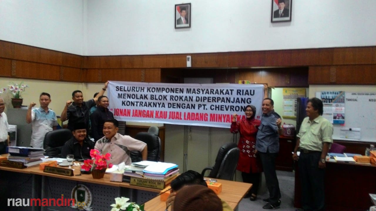 Adapun isi spanduk Komisi IV tersebut adalah bertuliskan 'Seluruh komponen masyarakat Riau menolak Blok Rokan diperpanjang kontraknya dengam PT CPI. Jonan Jangan Kau jual ladang minyak kami'.