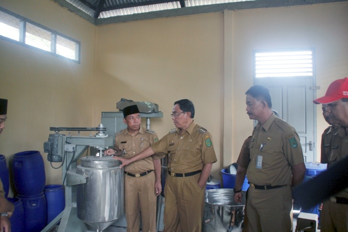 RIAUMANDIRI.CO, TEMBILAHAN - Bupati Indragiri Hilir HM Wardan meninjau alat pengolah kelapa terpadu di Desa Pulau Palas, Dusun Sungai Sirih, Kecamatan Tembilahan Hulu, dan Desa Sungai Ara Kecamatan Kempas, Senin (30/7/2018).