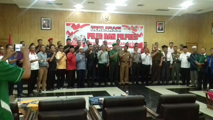 RIAUMANDIRI.CO, RENGAT - Forum Koordinasi Pimpinan Daerah (Forkopimda) Indragiri Hulu bersama pimpinan partai politik menggelar deklarasi pemilihan legislatif dan pemilihan presiden dengan tema "Yang Aman, Damai, dan Sejuk", Senin (3/9/2018) siang di Gedung Sejuta Sungkai Rengat.