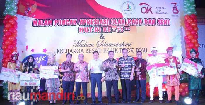 RIAUMANDIRI.CO, PEKANBARU - Forum Komunikasi Industri Jasa Keuangan (FKIJK) Riau yang memayungi sejumlah asosiasi di bidang industri jasa keuangan di Riau melaksanakan Malam Puncak Apresiasi Olahraga dan Seni Sempena HUT RI ke-73, Senin (3/9/18) lalu.