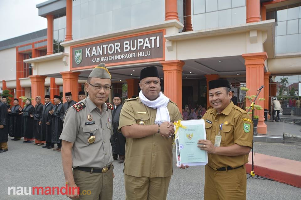 Usai menerima sertifikat tersebut, Bupati menyerahkan sertifikat tersebut kepada Plt Kepala Badan Pengelolaan Aset dan Keuangan Daerah (BPKAD) Kabupaten Inhu, Ibrahim Alimin.