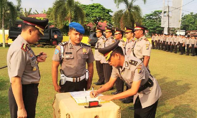 Kapolres Kampar, AKBP Ery Apriyono, menyaksikan penandatanganan berita acara sertijab pejabat utama Polres Kampar, di halaman Mapolres Kampar, Senin (10/3).