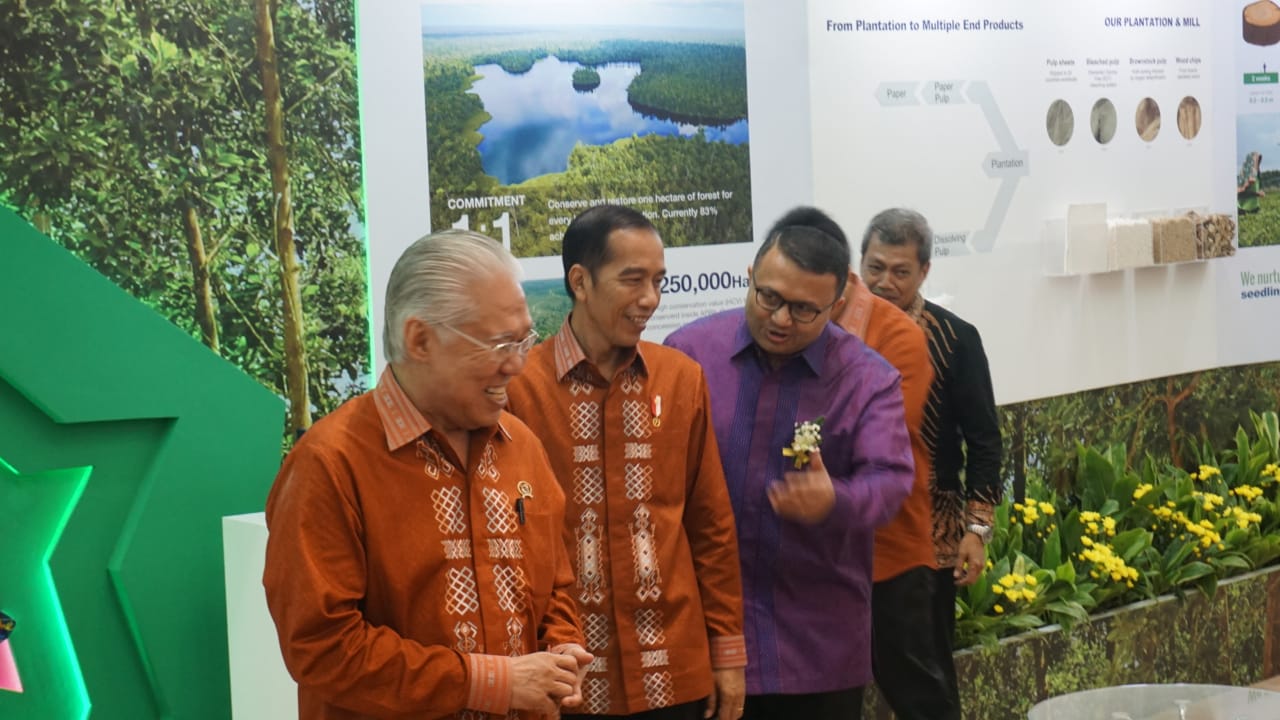 Didampingi Menteri Perindustrian Enggartiasto Lukita dan Kepala Badan Ekonomi Kreatif Triawan Munaf, Presiden Jokowi menerima penjelasan dari management APRIL seputar flagship produk PaperOne™ yang berkualitas ekspor dan diproduksi seutuhnya di Indonesia. Selain itu, APRIL juga menerangkan seputar komitmen 1:1 perusahaan dimana setiap satu hektar untuk perkebunan berarti satu hektar pula untuk konservasi serta program Restorasi Ekosistem Riau.