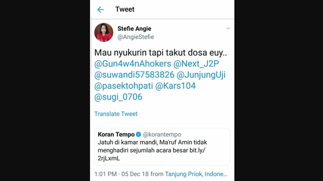 Stefie berkomentar seperti itu menanggapi berita dari Tempo Online berjudul “Jatuh di Kamar Mandi, Ma’ruf Amin tidak Menghadiri sejumlah Acara Besar”.