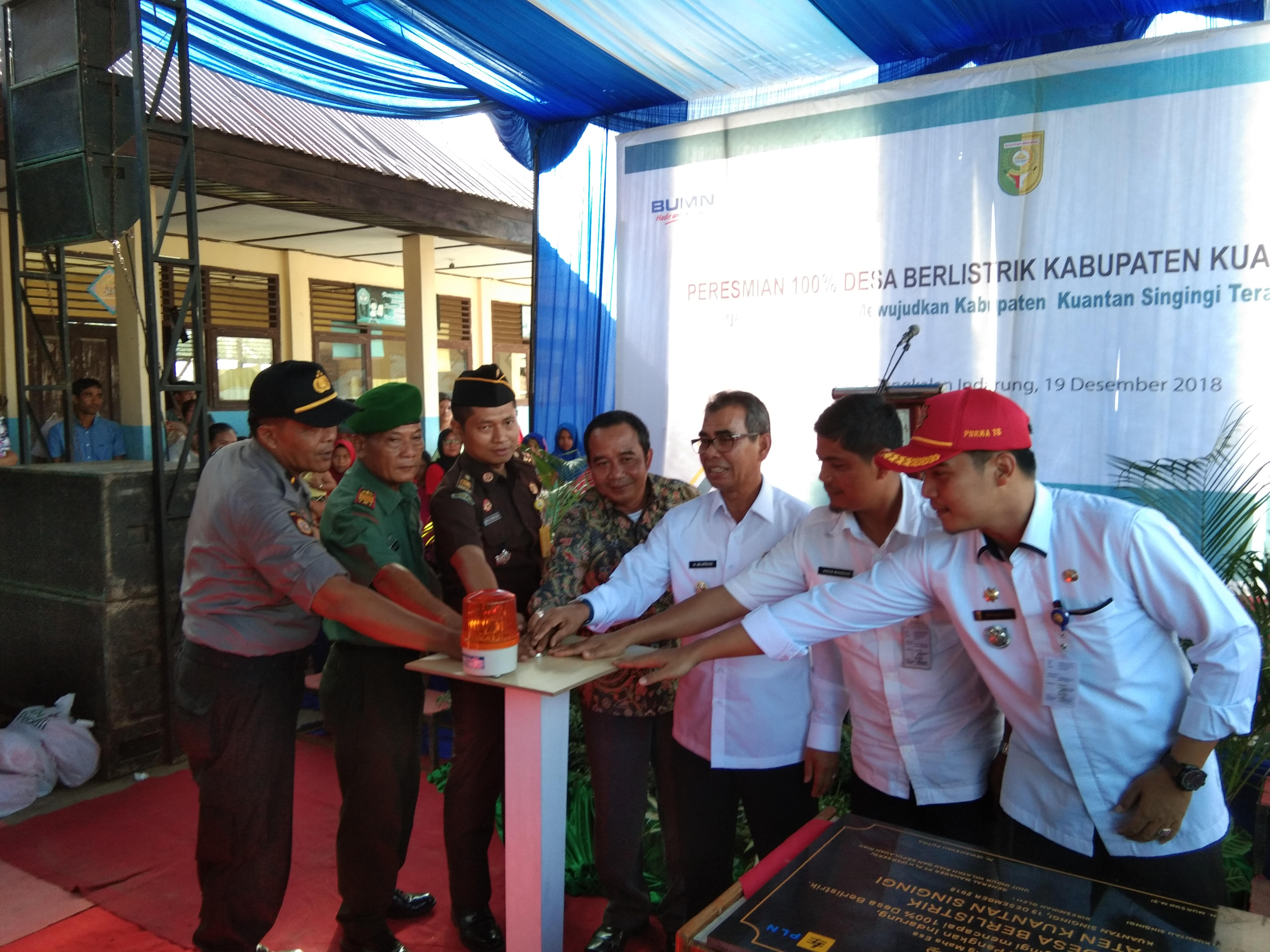 RIAUMANDIRI.CO, TELUK KUANTAN - Perusahaan Listrik Negara (PLN) bersama Pemerintah Kabupaten Kuantan Singingi menyalakan desa terakhir yang belum berlistrik pada acara peresmian 100 Persen Desa Berlistrik di Desa Pangkalan Indarung Kecamatan Singingi, Kabupaten Kuantan Singingi, Rabu (19/12/2018).
