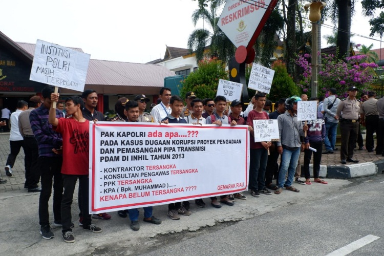 "Aksi kita ini, untuk mengkritisi penegak hukum dalam hal ini Dit Reskrimsus Polda Riau dalam pengusutan dugaan pengadaan dan pemasangan pipa transmisi PDAM di Kabupaten Inhil," teriak Sandi.