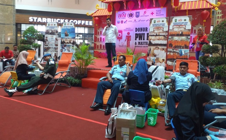 RIAUMANDIRI.CO, PEKANBARU - Peserta donor darah yang ditaja Persatuan Wartawan Indonesia (PWI) Riau bersama mitra dalam rangka Hari Pers Nasional (HPN) membludak, Rabu (30/1/2019) di Mal SKA. Dari target 73 kantong darah, terkumpul 81 kantong darah.