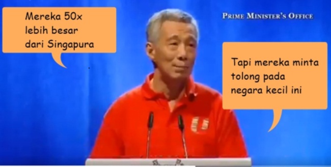 Lee menyindir Indonesia yang negaranya 50 kali lebih besar dari Singapura dan berpenduduk 250 juta orang, tapi dari waktu ke waktu selalu meminta tolong datangkan investor, padahal kata Lee, Singapura sudah menjadi investor asing terbesar di RI.