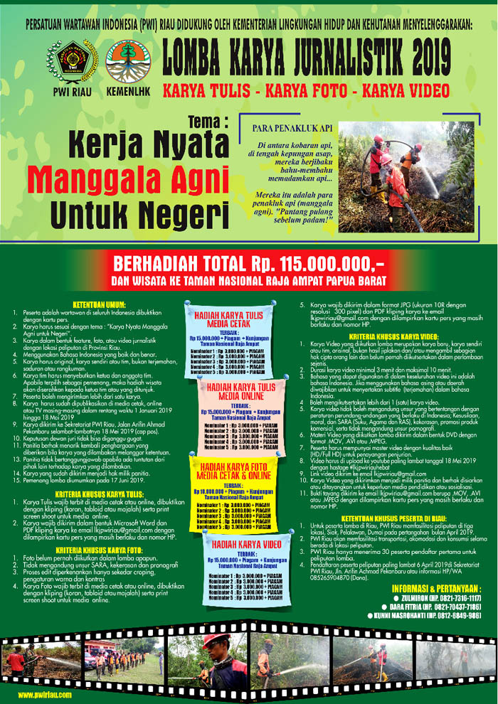 RIAUMANDIRI.CO, PEKANBARU - Persatuan Wartawan Indonesia (PWI) Provinsi Riau bersama Kementerian Lingkungan Hidup dan Kehutanan (LHK) menggelar Lomba Karya Jurnalistik (LKJ) bagi seluruh wartawan di Indonesia.