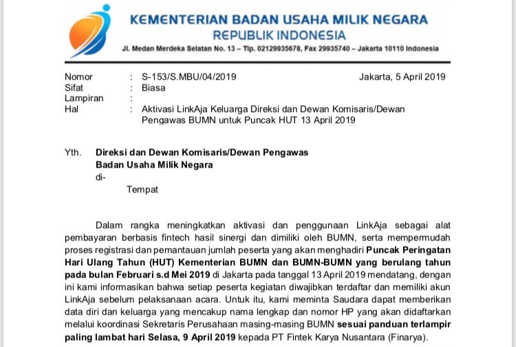 Surat imbauan Kementerian BUMN kepada keluarga besar pegawai BUMN beredar di media sosial. Mantan Sekretaris Jenderal Kementerian BUMN, Said Didu, mengunggahnya melalui akun twitter.