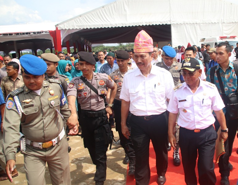 Menko Maritim Luhut Panjaitan memberikan sambutan saat launching STTKSI di Kawasan Teknopolitan, Langgam.