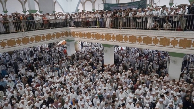 Salat jenazah dilaksanakan di Masjid Az-Zikra, Sentul, Bogor, Kamis (23/5). Salat diimami oleh putra sulung Ustaz Arifin Ilham, Muhammad Alvin Faiz, yang turut dimakmumi Ustaz Yusuf Mansur, Menteri Agama Lukman Hakim, politikus PKS Hidayat Nurwahid, Salim Segaf, hingga Wali Kota Bogor Bima Arya.