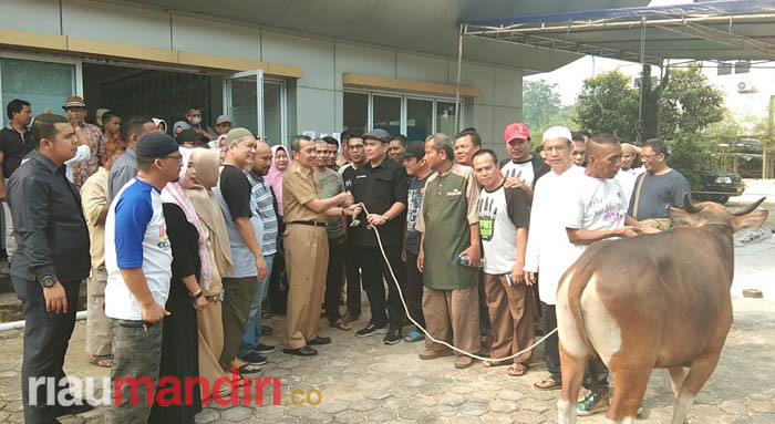 RIAUMANDIRI.CO, PEKANBARU - Sempena Hari Raya Idul Adha 1440 Hijriah, Persatuan Wartawan Indonesia (PWI) Riau menyembelih tiga ekor sapi kurban, satu ekor di antaranya bantuan dari Pemprov Riau yang diserahkan langsung oleh Gubernur Riau H Syamsuar kepada Ketua PWI Riau H Zulmansyah Sekedang, Senin (12/8/2019) di halaman belakang Kantor PWI Riau Jalan Arifin Achmad, Pekanbaru.