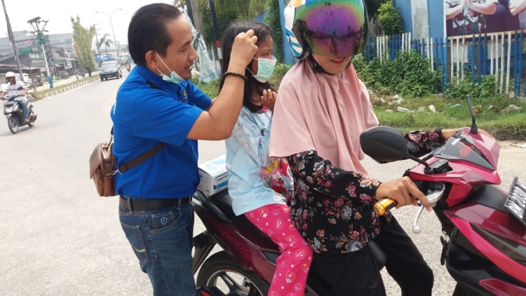 RIAUMANDIRI.CO, ROKAN HILIR - Guna mengantisipasi terjadinya bermacam penyakit akibat kabut asap yang melanda di wilayah Kabupaten Rokan Hilir, PWI Rohil membagikan 350 masker penutup hidung secara gratis kepada lapisan masyarakat pengguna jalan, Rabu (11/9/2019) sekira pukul 10.00 Wib.