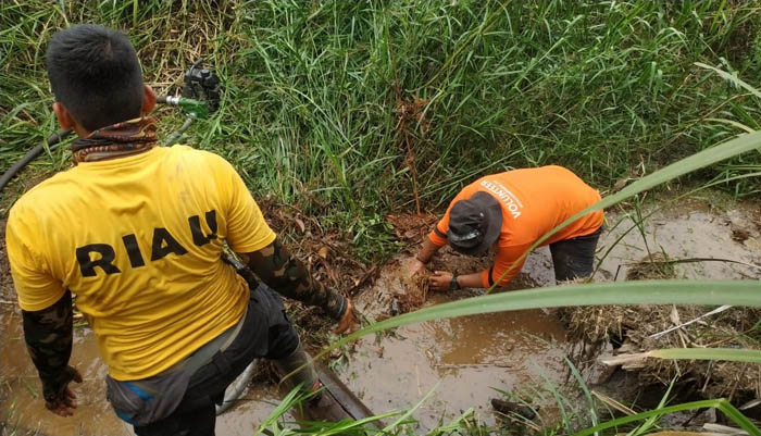 Tim Relawan Rumah Zakat bersama tim satgas Karhutla Pelalawan tidak kehabisan akal. Hanya berbekal peralatan seadanya, tim terpaksa harus menggali parit dan rawa yang masih berlumpur guna mendapatkan air.