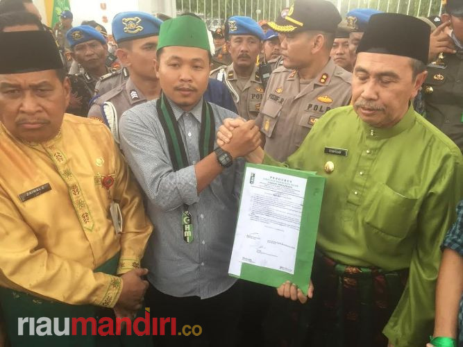Usai mendapatkan penjelasan dari Gubernur Riau, mahaiswa HMI meminta Gubernur Riau menandatangani tuntutan mereka.