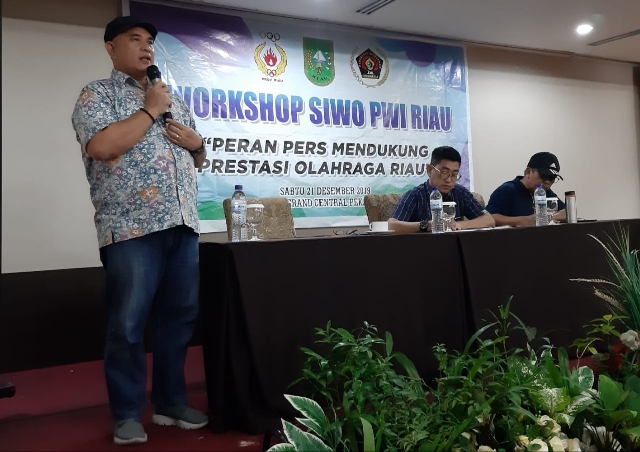 RIAUMANDIRI.ID, PEKANBARU - Ketua PWI Riau H Zulmansyah Sekedang resmi membuka Workshop Seksi Wartawan Olahraga (SIWO) PWI Riau bertajuk "Peran Pers Mendukung Prestasi Olahraga Riau" di Hotel Grand Central Pekanbaru, Sabtu (21/12/2019).