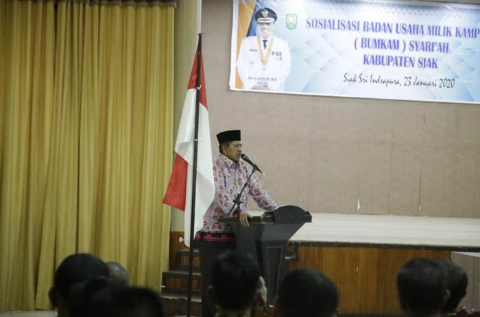 RIAUMANDIRI.ID, SIAK - Bupati Siak Alfedri membuka secara resmi Sosialisasi Badan Usaha Milik Kampung (Bumkam) Syariah yang ditaja oleh Dinas Pemberdayaan Masyarakat dan Kampung (DPMK) Kabupaten Siak di Gedung Tengku Mahratu Siak, Kamis (23/1/2020).