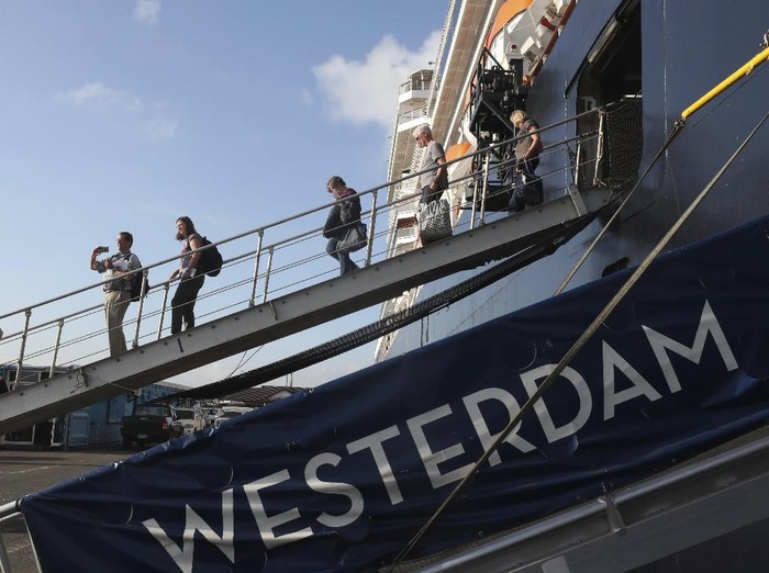 Kapal pesiar MS Westerdam sebelumnya ditolak berlabuh di lima negara setelah sempat mampir ke Hong Kong. Dua minggu terkatung-katung di lautan, kapal itu akhirnya bisa berlabuh di Sihanoukville, Kamboja.