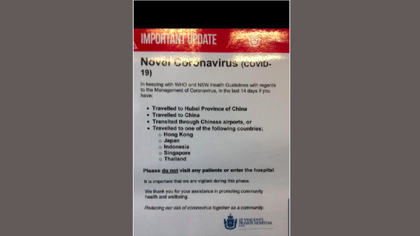 "Jika dalam 14 hari terakhir Anda mengunjungi salah satu negara ini, bila Anda merasa tidak enak badan atau melakukan kontak dengan orang sakit, tolong jangan menjenguk pasien di rumah sakit," tulis St Vincent's Hospital Sydney.